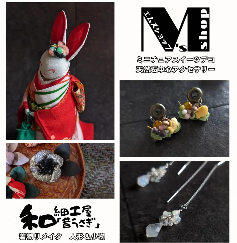 春日部市のパーツ屋“M’s shop”が母娘作家で出店!ミニチュアスイーツデコ・天然石中心アクセサリーの娘と、昔懐かしい着物を、ほっこりするうさぎ人形にする母です。