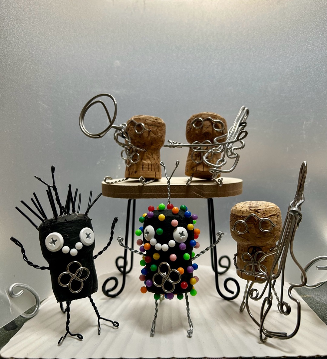 ・好きな形、色のコルク栓を選んで、猫、犬、くま、ロボットなどのマスコット人形を作ります。(600円)
