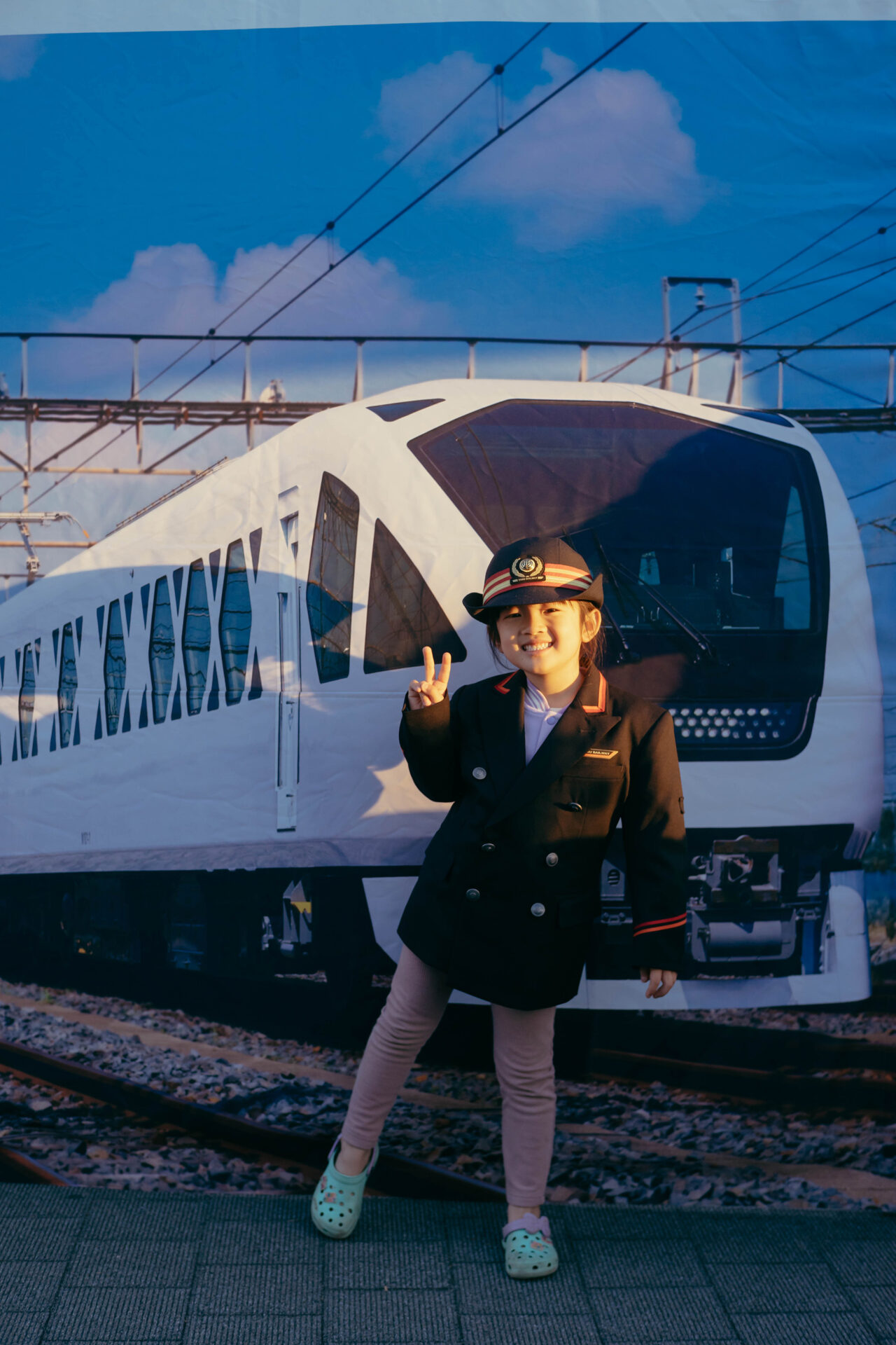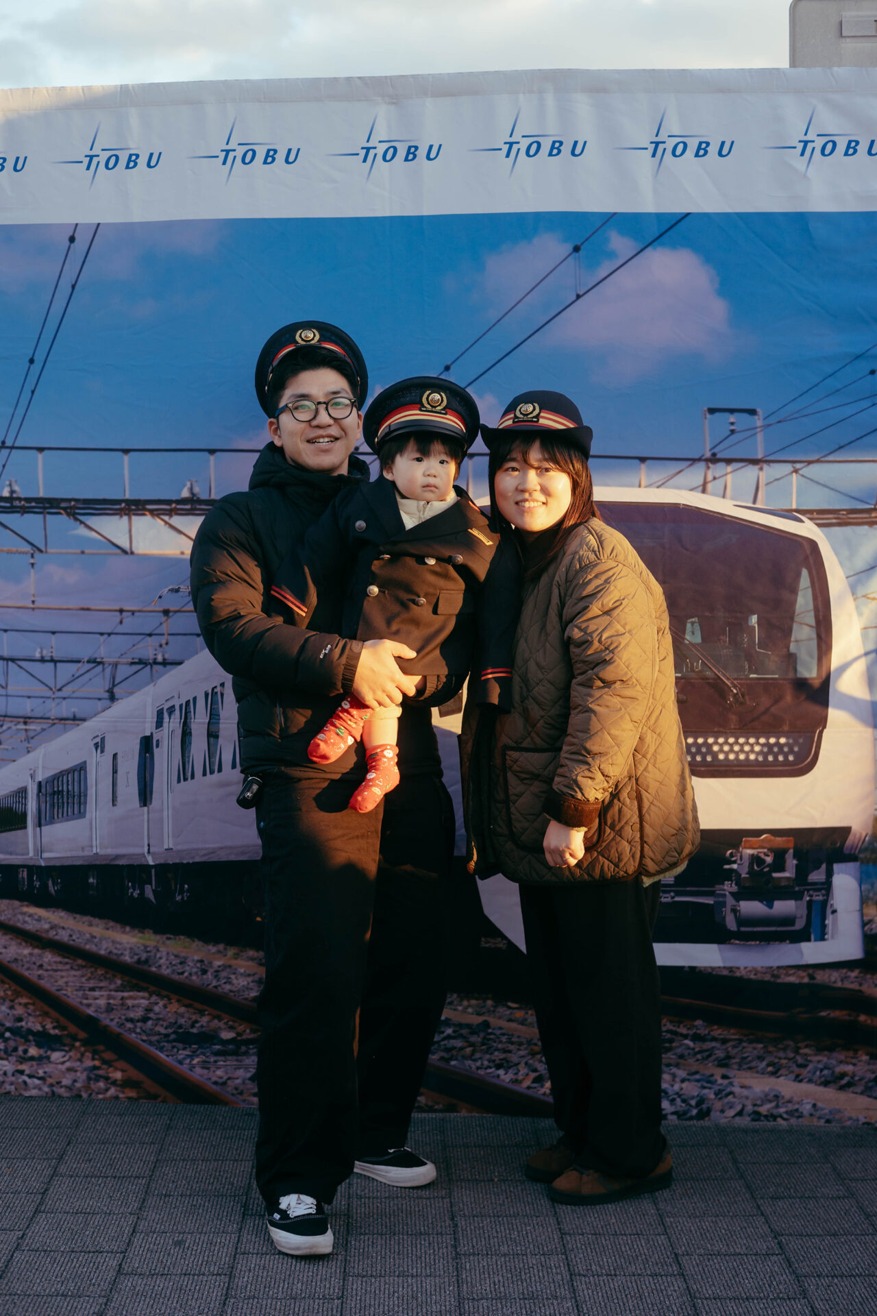 東武鉄道のブースでは、制服を着て写真を撮ることができます。袖が余っているけれど、誇らしげに胸を張る姿は、どこか一人前です。