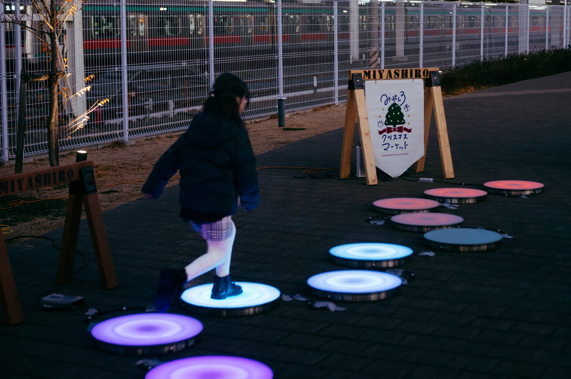 クリスマスツリーの近くに設置された「ドレミステップライト」は、暗がりの中でピカピカと光り、踏むたびに音が鳴ります。子どもたちはきゃっきゃと笑いながら、音と光を楽しんでいました。