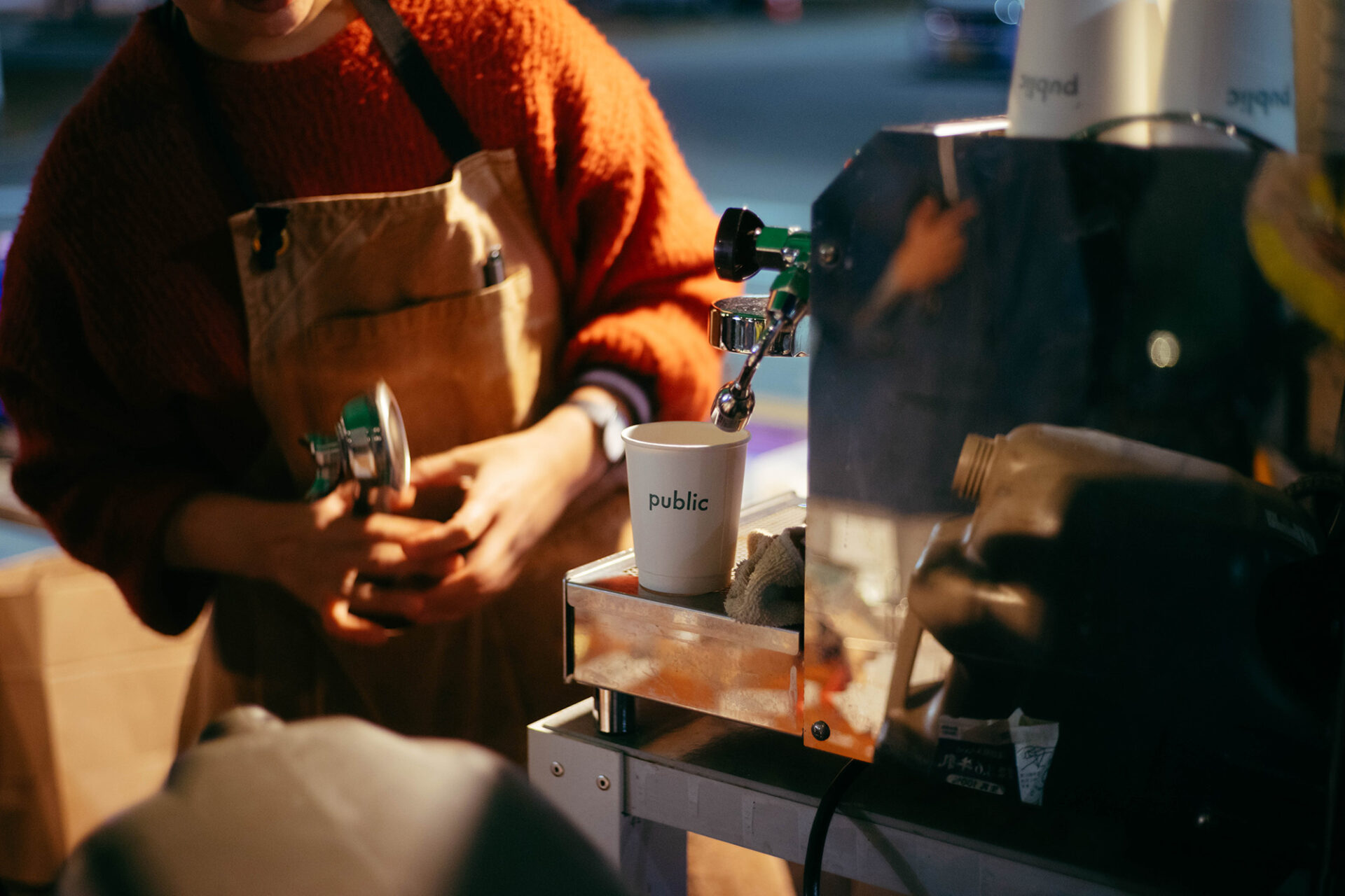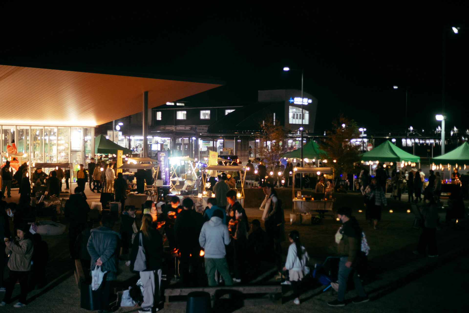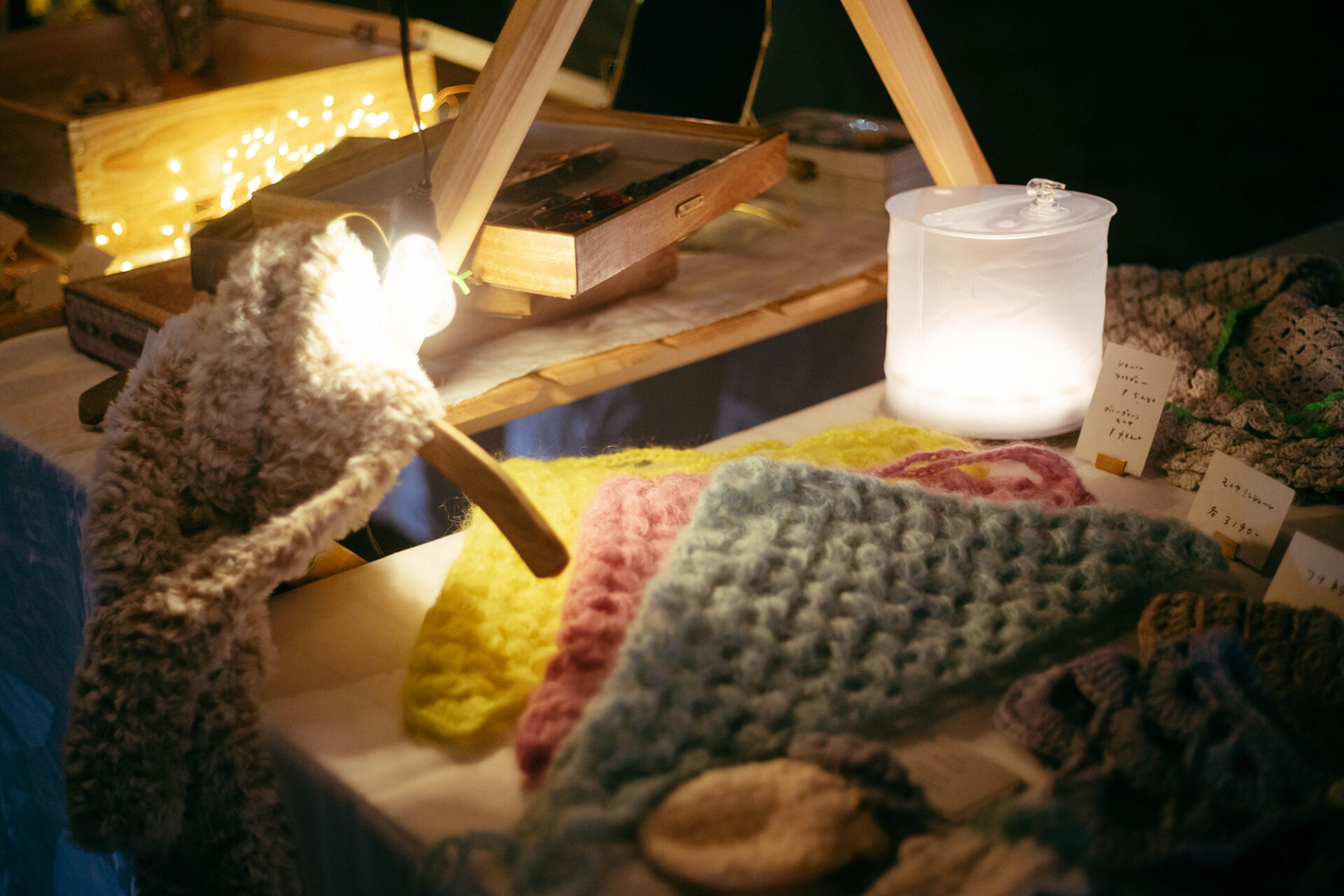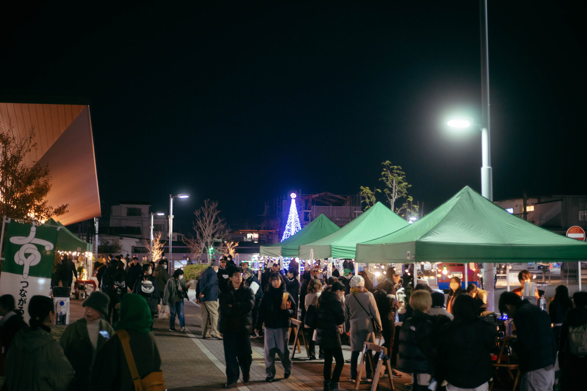 寒空の下、キッチンカーには長い列ができ、あちこちで出店者とお客さんが楽しそうに言葉を交わす。会場は軽やかな音色に包まれて、ブースに吊るされたライトもやさしく揺れる。