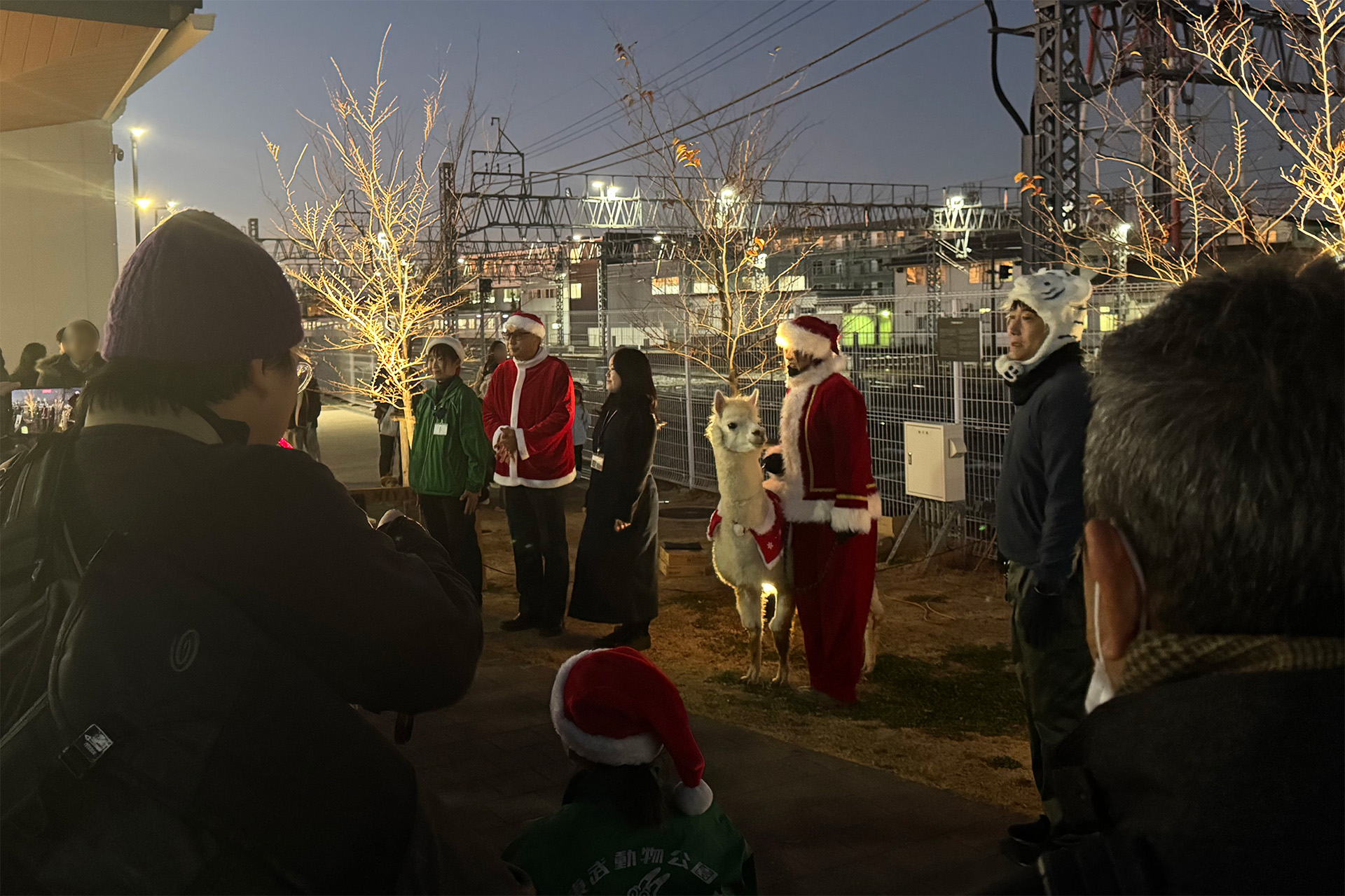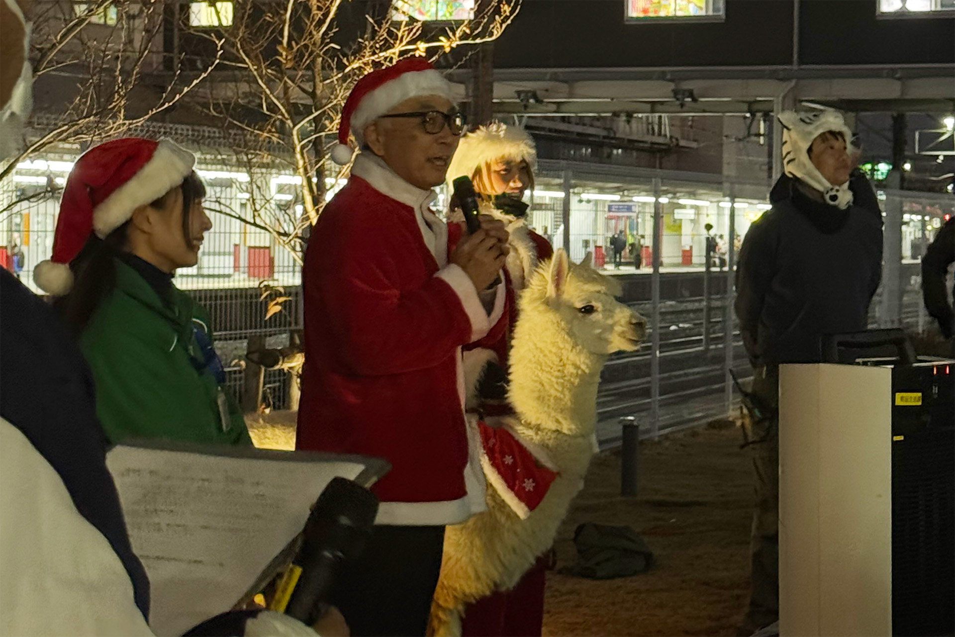 新井町長、無印良品 東武動物公園駅前の佐藤店長、東武動物公園のアルパカ・しらたまちゃんが並び、点灯までのカウントダウンがはじまります。