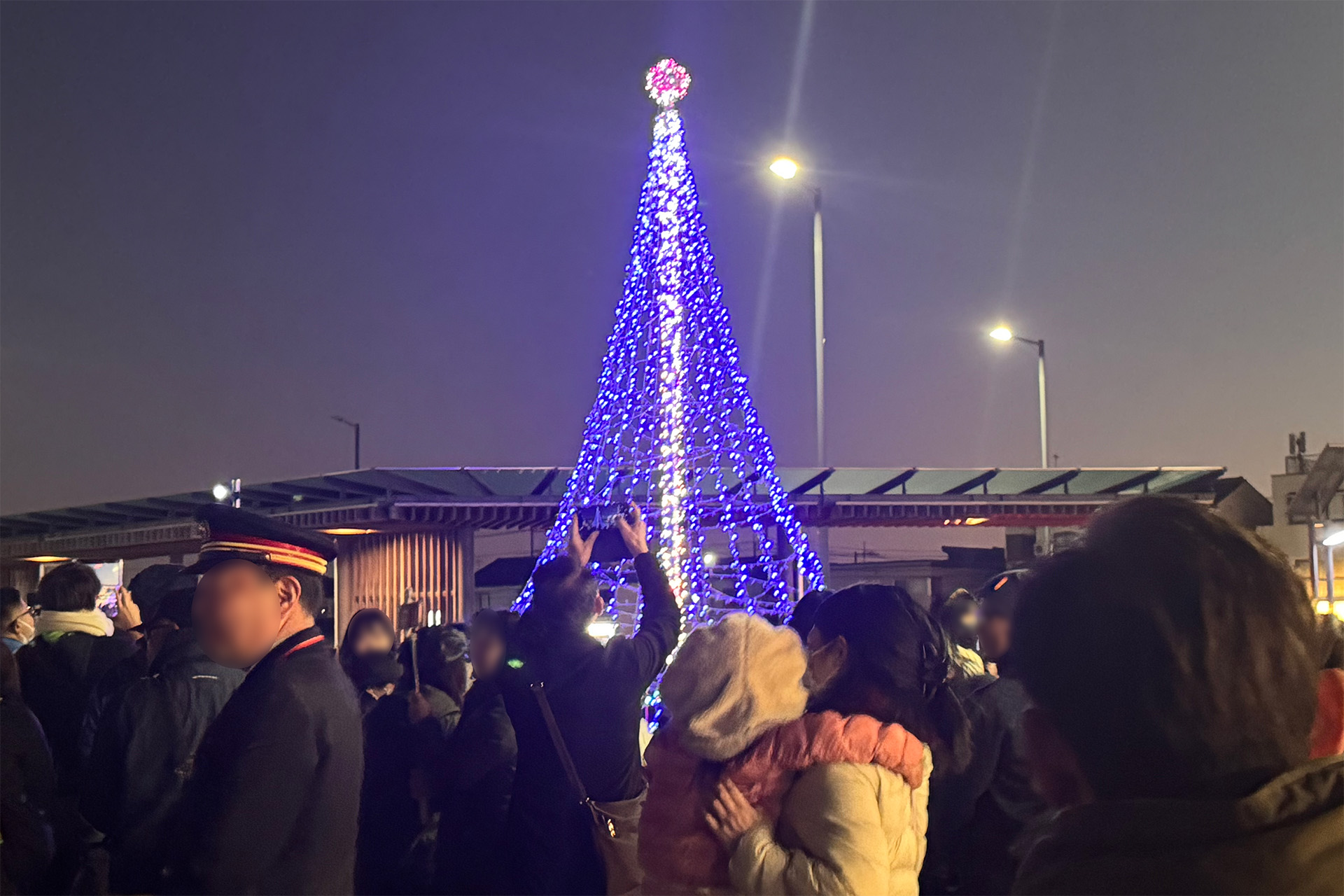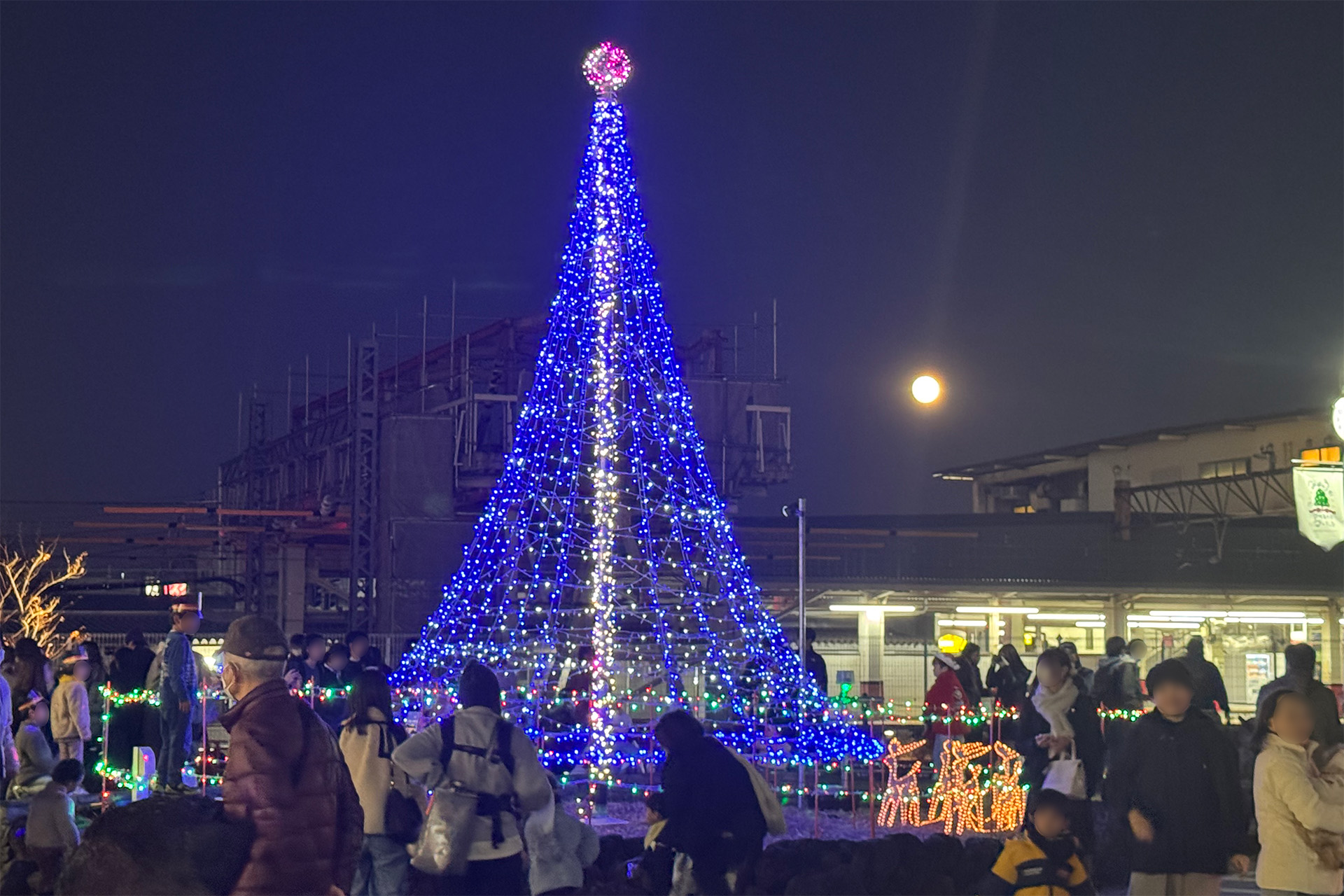 駅前に青い光が一斉に広がり、思わず歓声が上がりました。しかもこの日は満月。雲ひとつない夜空に綺麗に浮かぶ月と、まばゆく輝いたクリスマスツリー。その2ショットをカメラに収めようと、道のあちこちで人が立ち止まっていました。